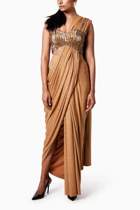 Composition- Silk and Shimmer Jersey Colour- Gold Fit-This sari fits true to size, takes the shape of your body as it is a drape. The sari is high waisted, get it according to your high waist size. The blouse is cut for a slim fit. Customization - There will be an additional 10% charge Size Guide- Measurements in the size guide are ready garment measurements Components- Product code - SVE43182220211&1181601