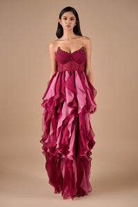 Make a statement in this breathtaking corset ruffle gown, designed to capture both romance and drama. The structured corset bodice beautifully contours the figure, offering a flattering, sculpted silhouette. Cascading layers of rich ruffles flow effortlessly from the waist, creating movement and volume with every step. Crafted in deep shades of plum and magenta, this gown exudes sophistication and allure — perfect for red-carpet events, galas, or elegant soirées. A true blend of timeless femininity and modern glamour.