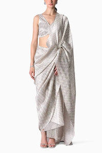 Our new Cosmo Sari comes with a built in petticoat. Lightweight, fuss free and easy to wear, it? the perfect piece to carry to destination weddings. Pair it with our new Cosmo Top which has a deep V neck and a curved shaped hem.