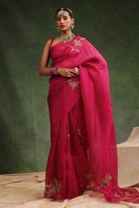 Meticulously crafted to make you shine on special occasions, it is Intricately hand embroidered and worked with zari this majestic saree showcases exceptional craftsmanship and attention to detail.