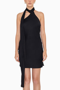Featuring Cosmopolitan Dress by Contemponari. This short dress offers a close fit with a halter neck and a skin-baring open back. It features an elegant draped scarf extension, providing versatile styling options.