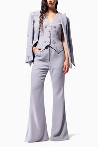 This ash grey tailored suit exudes elegance, featuring a classic peak lapel jacket with intricate hand-embroidered detailing. The three-piece set includes a perfectly tailored jacket and wide-bottom pants, creating a streamlined silhouette that blends sophistication with modern flair.