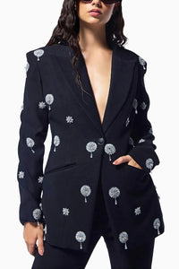 This classic black tailored jacket is elevated by intricate hand-embroidered detailing, adding a touch of luxury to its sleek design. Featuring a peak lapel and a tailored fit, it offers a refined silhouette perfect for both formal and stylish occasions.