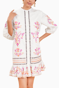 Effortlessly chic and playful, this short dress blends bohemian charm with timeless elegance. Crafted from soft, breathable cotton, it features intricate embroidery on the front, adding a touch of artisanal beauty. The button-down design offers versatility, while the delicate frill at the hem brings a feminine and whimsical flair