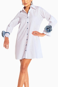 Featuring cotton shirt dress with contrast stitch line details, and elasticated hem sleeves. Comes with detachable denim rose bands.