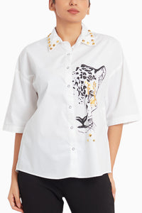 Introducing the White Comfort Fit Cotton Shirt with Foil Print and Studs. Crafted from soft cotton, this regular-fit shirt features a bold foil print and stud highlights, adding a touch of modern edge to its classic white design. Perfectly combining style and comfort, it's an ideal choice for both casual and semi-casual occasions.