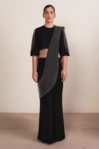 The Contour Pallu Saree in classic black features a leisure-stitched crystal blouse and a pleated skirt shaped at the knee. The boxy crop top offers a round neckline and elbow-length sleeves adorned with signature transparent PVC embroidery. An attached contoured pallu with matching embroidery and zipper closures complete this elegant ensemble.
