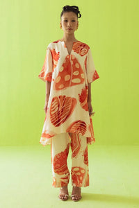 This cream co-ord set features an asymmetrical tunic and straight-cut pants with bold abstract prints in red and orange. Effortlessly modern, it blends playful design with relaxed comfort.