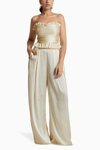 Featuring Cream Balanca Top with Breeze Cream Pants by Malie. This Co-ord set includes a bandeau style top with wide-leg pants. Top has an elasticated back for stable comfort with heart-shaped neckline and waistline ruffle detail add a chic, feminine touch. Paired with pants that are designed with box pleats at the front of both legs for added structure and elegance. They include a side zipper closure for ease of wear and pockets on both sides for practicality.