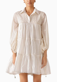 Featuring the Cream Balloon Sleeves Jamdani Dress by Nikasha from its Jamdani Collection. This elegant cream chanderi dress showcases delicate Jamdani embroidery on voluminous balloon sleeves, tiered layers, and refined stitch detailing—blending timeless craftsmanship with a graceful silhouette.