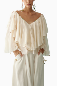 Featuring the Cream Banana Tree Applique Frill Top by Nikasha. Elevate your style with a cream frill top adorned with a delightful banana tree applique and meticulous hand-stitched details, crafted from 100% cotton. Embrace a charming blend of comfort and elegance.