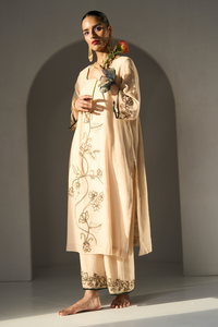 Featuring Cream Basant Kurta set by Sarang Kaur by Mansa Collection. This set adorns Chanderi silk Kurta and pants in a serene cream shade, combining traditional craftsmanship with contemporary flair, perfect for elegant and refined occasions.