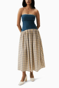 Featuring the Cream-Blue Riviera Dress by OSHIN's SS'25 collection. This midi-length dress boasts a fitted bodice with front and back darts, a sleek side zip closure, and a flared bottom—blending classic tailoring with effortless charm.