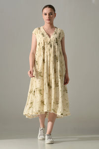 An Cream Cotton Silk and fabric dress featuring soft botanical prints and delicate pintex pleating that creates graceful movement and airy volume. Designed in a relaxed silhouette, the sheer texture lends effortless elegance.