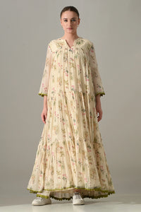 A Cream Cotton Silk fabric dress adorned with delicate floral prints, crafted in a softly tiered silhouette that flows with graceful movement. The sheer texture and airy volume create an effortless elegance.