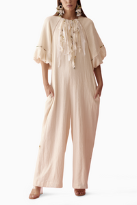 Featuring the Cream Fringe Neckline Jumpsuit by Nikasha. This jumpsuit exudes charm with its fringe detail on the neckline and banana tree applique, all in luxurious 100% cotton.