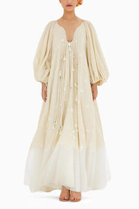 Featuring Cream Hand Woven Jamdani Maxi Dress by Nikasha from Under The Banyan Tree Collection. Accentuating hand-braided tassel details on the neckline, Kota Doriya accents at the hem, and elegant bubble sleeves, this dress combines artisanal charm with timeless sophistication.