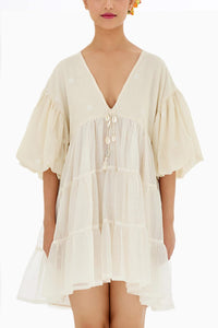 Featuring Cream Hand Woven Tier Dress by Nikasha from Under The Banyan Tree Collection. Crafted from hand-woven Polka Dot Jamdani. This dress showcases playful bubble sleeves and a delicate blanket stitch detail on the neckline, offering a chic, artisanal touch to a classic silhouette.