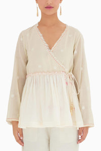 Featuring Cream Hand Woven Wrap Top by Nikasha from Under The Banyan Tree Collection. Crafted from hand-woven Polka Dot Jamdani, this top adorns intricate hand-stitch details on the neckline and cuffs, blending traditional craftsmanship with a modern wrap design for a sophisticated and versatile look.