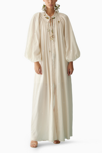 Featuring the Cream Handwoven Jamdani Cotton Bubble Sleeves Overgarment by Nikasha. Elevate your style with banana tree applique and exquisite handmade flower tassels detailing.