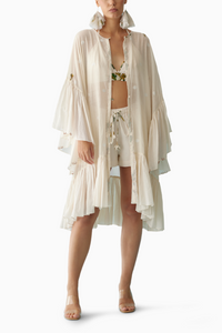 Featuring the Cream Handwoven Jamdani Cotton Overgarment by Nikasha. Embrace elegance with banana tree applique and handmade flower tassels detailing, creating a stunning ensemble.