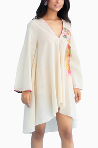 Featuring Cream Hi-Low A-Line Dress by Nikasha from Matchbox Series. Elevate your wadrobe in mini dress with fabric ribbon embroidery applique details in 100% seersucker cotton.