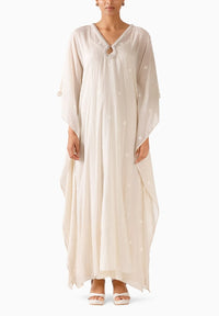 Featuring the Cream Jamdani Pearl Embroidered Kaftan by Nikasha from its Jamdani Collection. This elegant cream kaftan dress showcases intricate Jamdani pearl embroidery and comes with a soft slip lining—offering a sophisticated, comfortable silhouette with artisanal detail.