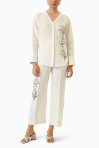 Featuring Cream Linen Floral Co-ord Set by Anahe Design. Discover luxurious comfort and elegance with our cream linen set, delicately adorned with flower embroidery. This set combines the softness of linen with the beauty of floral details, creating an elevated loungewear ensemble that exudes sophistication.