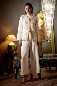 Featuring the Cream Lumiere Jacket Set by ANAHE, this exquisite ensemble includes a jacket with delicate pearl hand embroidery. The soft cream hue and intricate detailing create an elegant, timeless look, perfect for adding sophistication to any occasion.