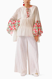 Featuring the Cream Mul-Mul Pomegranate Top by Nikasha from its Pomegranate Collection. This ivory cotton mulmul top showcases flared sleeves with pomegranate prints, a front knot, flower tassel accents, and intricate hand embroidery with an appliqué patch at the back—offering a unique, artisanal flair.