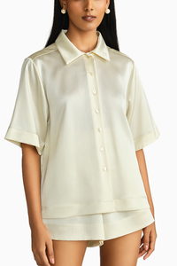 Featuring the Cream Silk Bowling Shirt by Refined Revolution. Luxuriously crafted from 100% silk charmeuse satin, adorned with shell effect buttons. Its A-line fit with back yoke gathers ensures a relaxed yet stylish look, true to size.