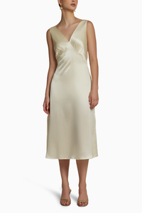 Featuring the Cream Silk Slip Dress by Refined Revolution. Embrace timeless sophistication in this slip dress, crafted from 100% silk charmeuse satin in cream. With an outer shell and lining in the same luxurious fabric, it features a back invisible zip closure and offers a true-to-size fit for effortless elegance.