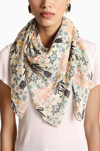 Get ready to steal the spotlight while wearing this cream tulip garden print poly chiffon soft feel full-width scarf. This scarf is 1 metre long and can be used as a travel wrap, bandana or stole.