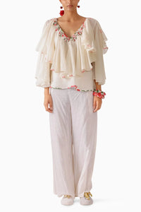 Featuring the Cream V-Neck Mul-Mul Ruffle Top by Nikasha from its Pomegranate Collection. This ivory cotton mulmul top features a flattering V-neckline adorned with braids and delicate ribbon embroidery, finished with soft ruffles—perfect for a feminine, artisanal look.