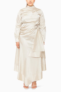 An elegant soft cream top with asymmetric draping and a side buckle is paired with a flowing skirt featuring asymmetrical layers. Crafted from lustrous, lightweight fabric, this sophisticated set offers comfort and modern elegance—ideal for formal or evening occasions.