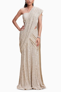 Redefine elegance with our ivory and gold saree skirt, enhanced with delicate sequin embroidery. Featuring a modern blouse and a subtle touch of sparkle, this outfit is designed to make you shine with grace and flair.