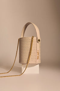 A study in contrasts, the Intermesh bucket bag pairs a smooth faux leather base in soft crème with a shimmering rhinestone mesh exterior. Accented with subtle gold hardware and a suede-lined pouch to hold your essentials, this sculptural statement piece subtly elevates any look.