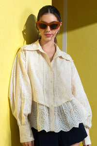 Expertly crafted with intricate broderie detailing, this blouse features an all-over palm pattern and a delicately scalloped bottom hem. A breezy and elegant choice for effortless summer styling.