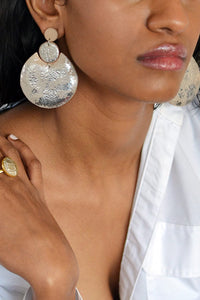 The crescent danglers are handcrafted in a patchy silver foil with beige leather and another in a flowvy black foil print on a soft black suede. The bold circles with the crescent shaped dangler makes it a perfect statement piece.