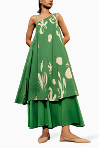 Featuring a forest green lino print mul dress with double layer at the hem.