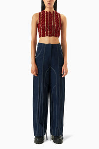 Brighten your look with our Crimson Knit Blouse paired with Denim Pants featuring stylish ties. The vibrant blouse offers a cozy yet chic fit, perfect for any occasion, while the denim pants add a modern touch with their unique tie detail at the waist. This ensemble combines comfort and versatility, making it ideal for everything from casual outings to more polished events.
