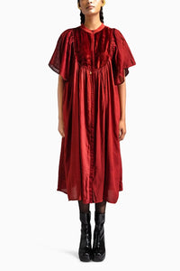 Moonlit button down Midi Dress is designed for intimate festive gatherings with its scintillating details that ring in celebrations. Matte Airy fabric is decorated with playful golden embroidery and quietly shimmering fluted sleeves along the lush velvet yoke finished with romantically all round gathers. The billowy silhouette makes you want to twirl from dusk to Dawn.