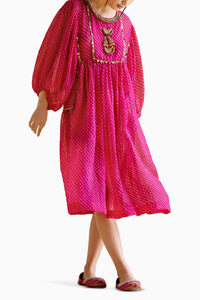 Featuring Cronus Pink Dress by 5 Elements by Radhika Gupta from Mitti Collection. This Lehriya printed dress adorns an embellished yoke with ghungroo embroidery. Its versatile design allows it to be effortlessly styled with pants, making it a chic and adaptable addition to any wardrobe.