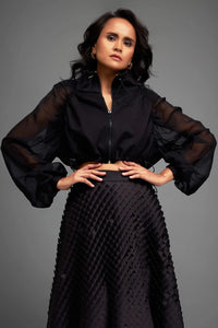 Cropped Bomber Black Jacket with Sheer Sleeves