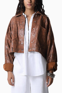 A wardrobe classic revamped for contemporary appeal. The Leather Jacket is cut in a cropped silhouette with relaxed drop shoulders. Cut in a textured faux leather, it is finished with silver hardware. It has chest patch pockets in the front and button slit detail at the back to add to the design. Pair it up with your dresses or over your shirts and trousers.