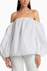 Featuring Crosby Snow White Top by Malie. This versatile cross-by-top combines off-shoulder allure with balloon sleeves and elasticated cuffs, offering dual styling options. Crafted from crisp 100% BCI cotton, it promises comfort and sustainability with a chic, adaptable design.