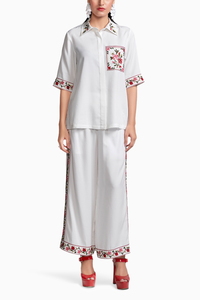 Featuring an ivory half-sleeve shirt with multicolor delicate cross-stitch embroidery on the patch pocket, cuffs, and collar, this shirt showcases short sleeves, a concealed placket, and is made from sustainable, breathable Tencel. It is paired with ivory wide-leg pants that also feature multicolor cross-stitch embroidery on the sides and bottom hem. The pants include an elasticated waist and side pockets, crafted from the same sustainable, breathable Tencel for a cohesive and stylish ensemble.