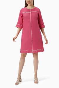 When diverging into something new and converging into blissful minimalism, a Crossroad round-neck dress, 3/4th sleeve with hand screen print in comfortable fit. Introducing a contemporary new range immersed in vibrant hues with striking stripe prints in contrast shades that boldly pervade on a body of luxurious linen.
