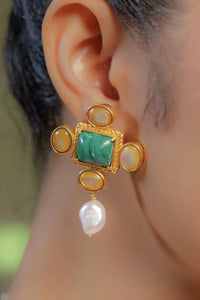 A stunning way to add a pop of colour to your look, these gorgeous 22kt gold plated earrings are dressed with Malachite, Pearl and Baroque Pearls drops. The earrings are trendy, dramatic and perfect statement jewellery. One often looks for travel jewellery that can transform your outfit with minimal efforts - and this pair does just that for you. A go-to pair when you want to rely on a pair of earrings to feel all dressed up. Wear the pair with matching pendant necklace form the collection for a coordinated look.