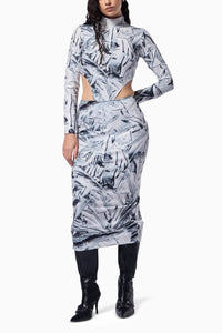 This trompe l'oeil print co-ord set features a unique crushed paper scanned print, offering a bold visual illusion. The set includes a bodysuit top with a high neckline and long sleeves, paired with a matching skirt that features a side zip. Crafted from stretchy, body-hugging fabric, this ensemble provides a flattering fit and modern style. In a striking black and white color combination, this set is perfect for making a statement.